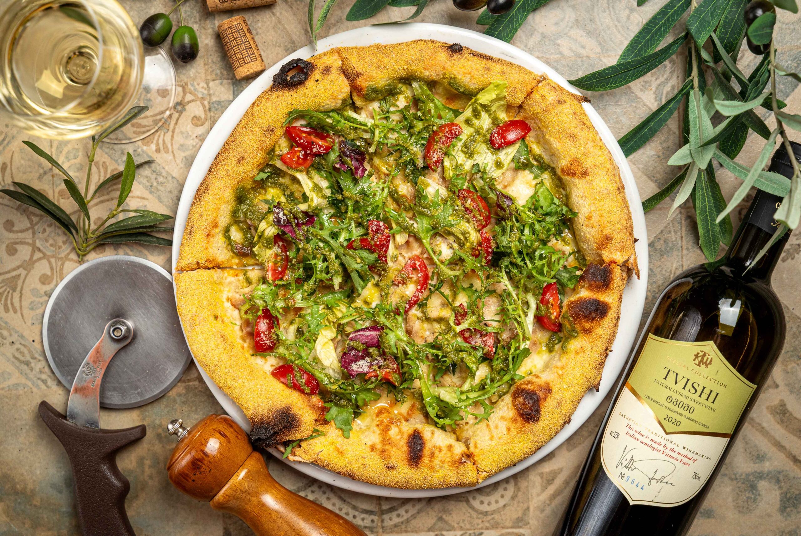 Цільнозернове тісто на заквасці, соус вершковий, курка власного копчення, томати чері, мікс-салат, соус песто, сир моцарела та пармезан.