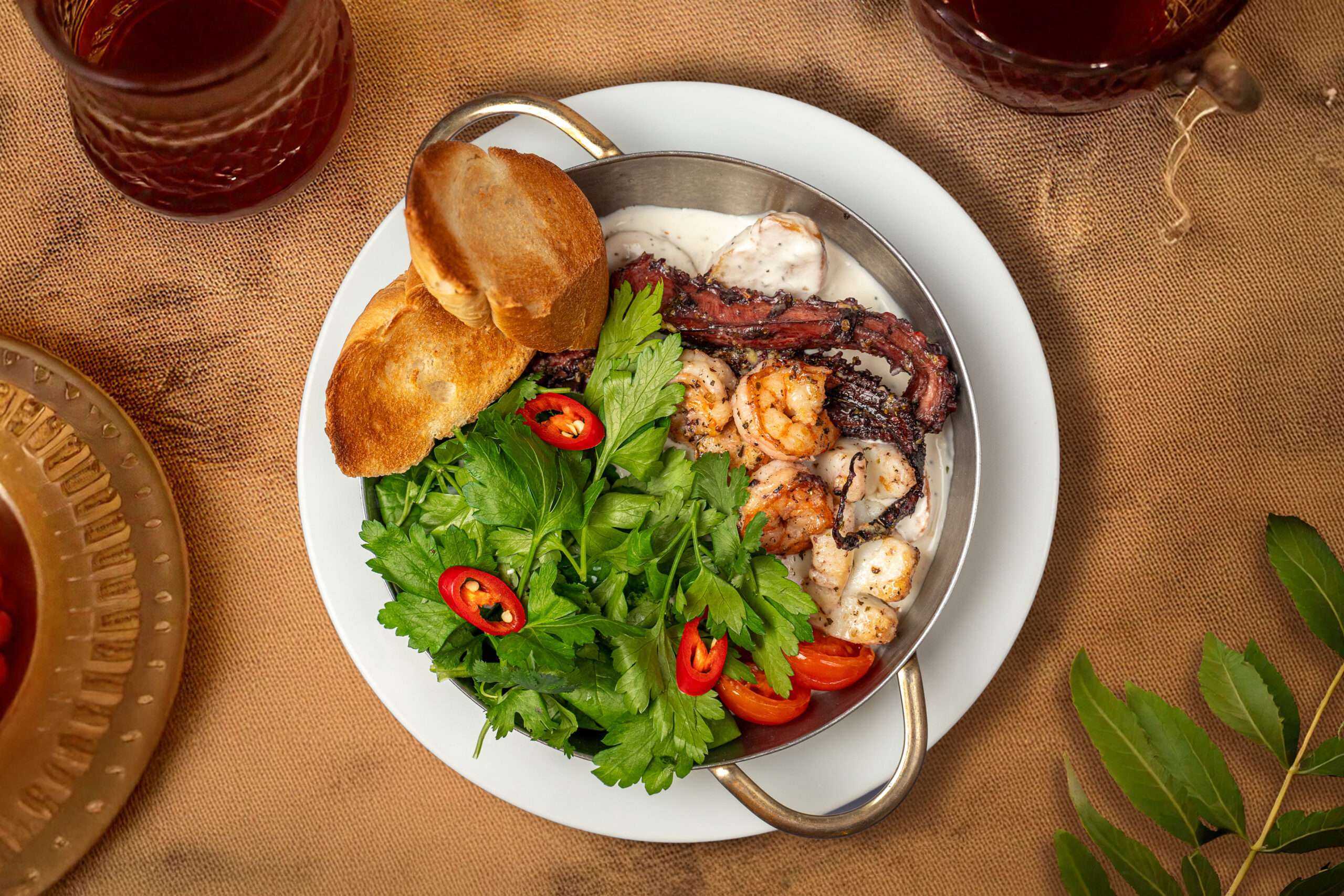 Восминіг, кальмар, креветки, томати чері, запечена молода картопля та зелень у вершково-винному соусі.